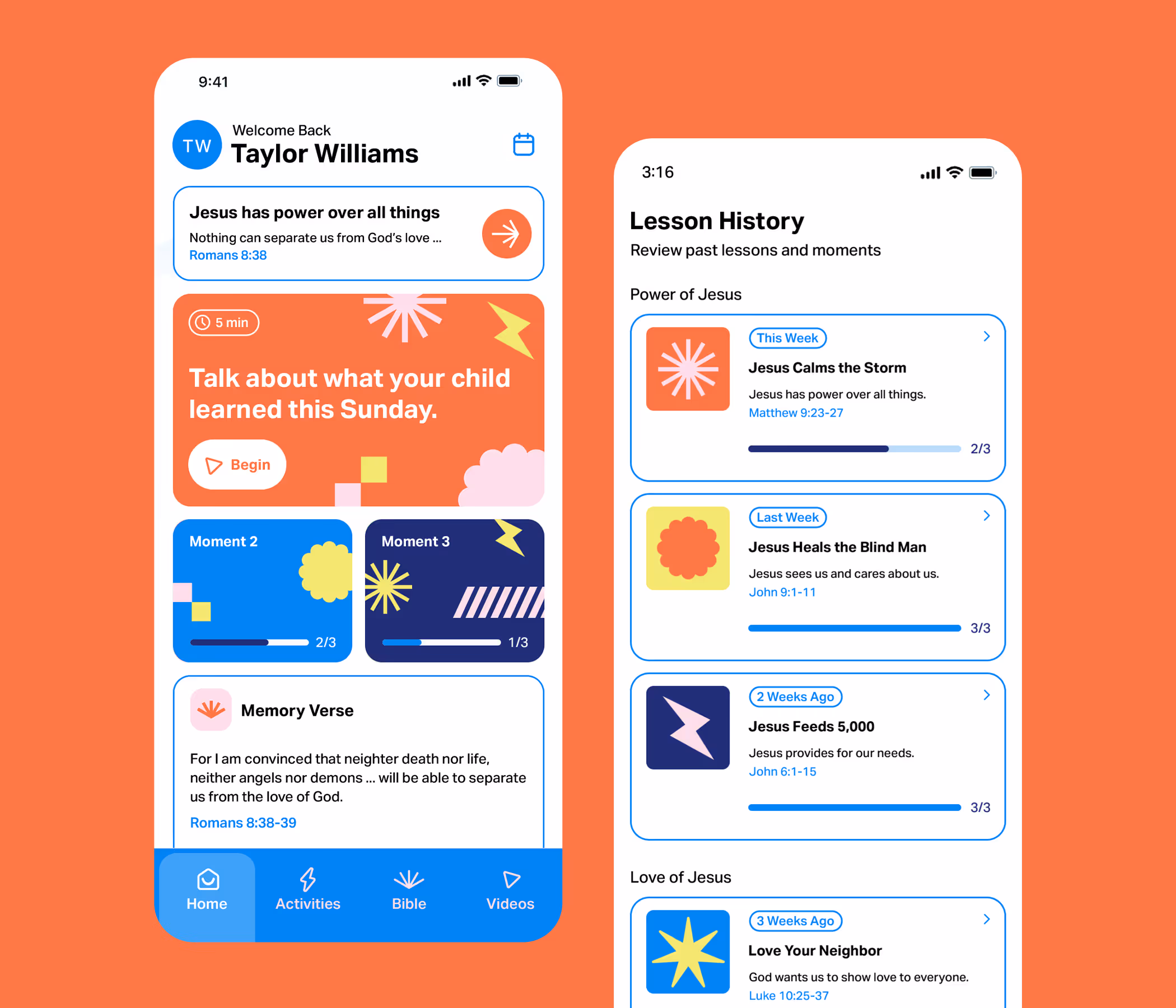 Turn classroom lessons into everyday discipleship. The RightNow Kids app shows parents what their kids are learning each week, including weekly videos and discussion questions, to help them guide their kids to know, love, and follow Jesus all week long.