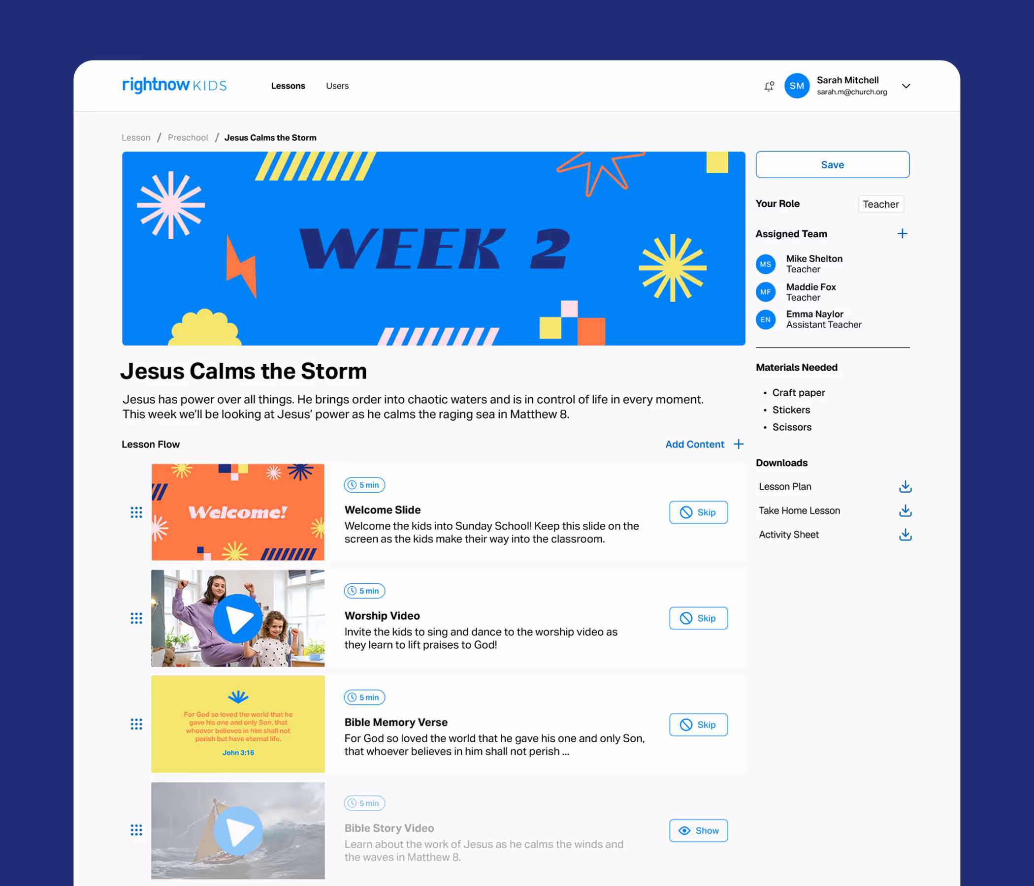Schedule and reschedule lessons to fit your church’s rhythm. Easily add, edit, and remove content from lessons based on each class’s needs. Assign volunteers to specific weeks so they have everything they need to lead, including written facilitator guides to make teaching easy.